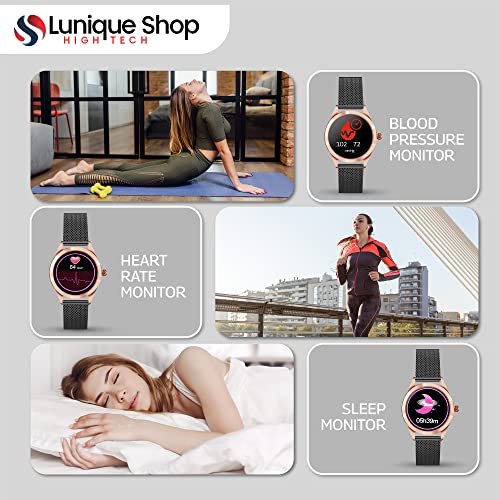 LUNIQUESHOP Ronde zwarte smartwatch, OLED touchscreen dameshorloge, waterdicht, stappenteller, hartslagmeting, calorieën, slaap, Android, iOS