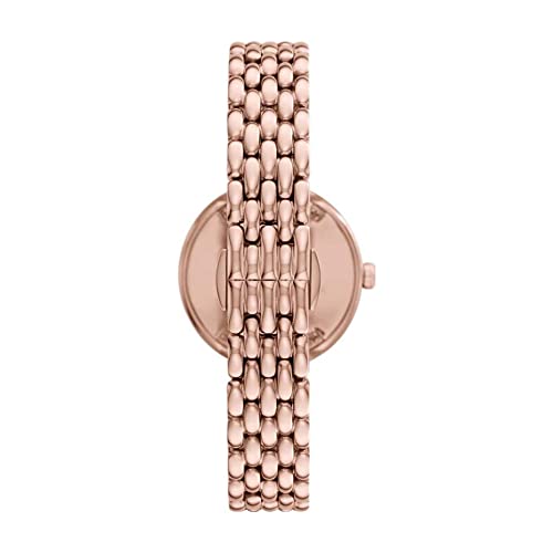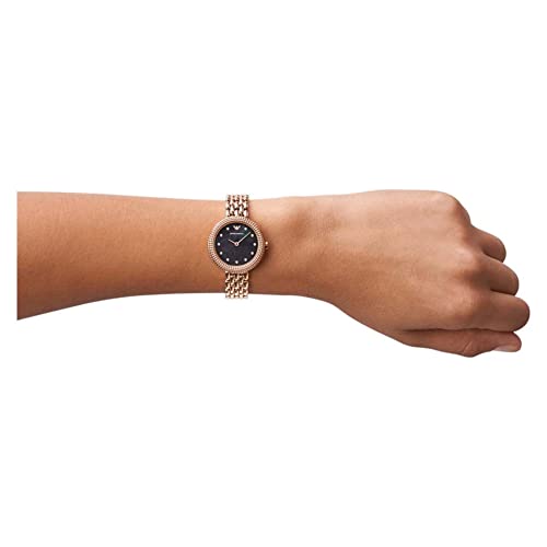 Dit Emporio Armani horloge van 30 mm heeft een zwarte parelmoeren glanzende wijzerplaat met glitters als uuraanduiding, bovenring met schoennagelpatroon, uurwerk met twee wijzers en een roségoudkleurige roestvrijstalen armband.