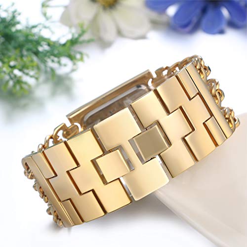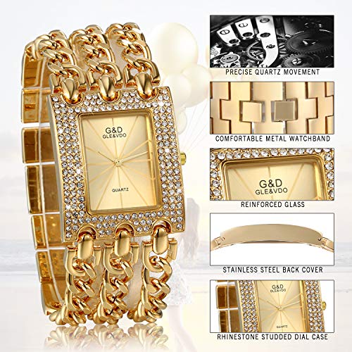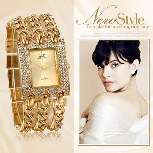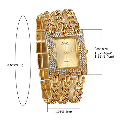 Specificaties: JewelryWe Eenvoudig quartz dameshorloge met vierkante wijzerplaat. Strass zilver- / goudkleurige kast, polshorloge met ketting bandje, Goud