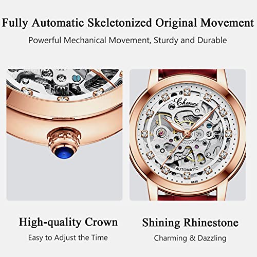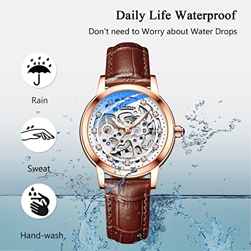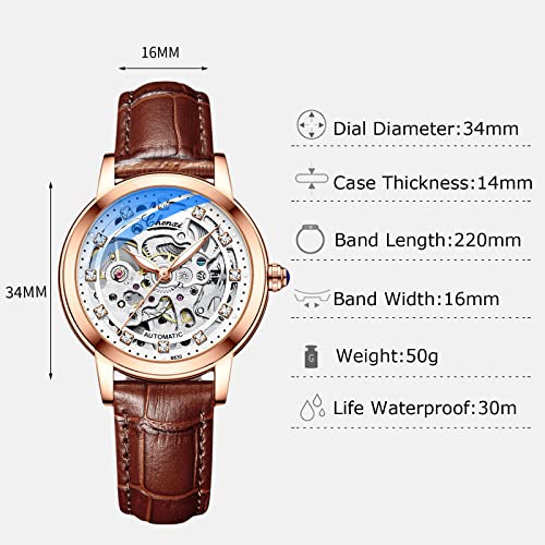 Specificaties: RORIOS Dameshorloge, waterdicht, mechanisch automatisch horloge met leren band, skeleton, tourbillon-horloges, modieus, oplichtend horloge voor meisjes en vrouwen